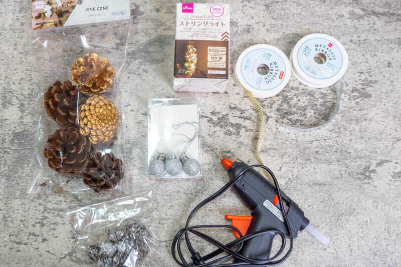 グルーガンや、松ぼっくり、ライトや、リボンを購入〜!
