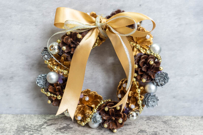 これは、松ぼっくりをひっつけてさらに飾りをひっつけまくりました。きれいな円になっていない感じも味があっていい感じ〜!ところどころグルーガンが見えているのはご愛嬌(笑)