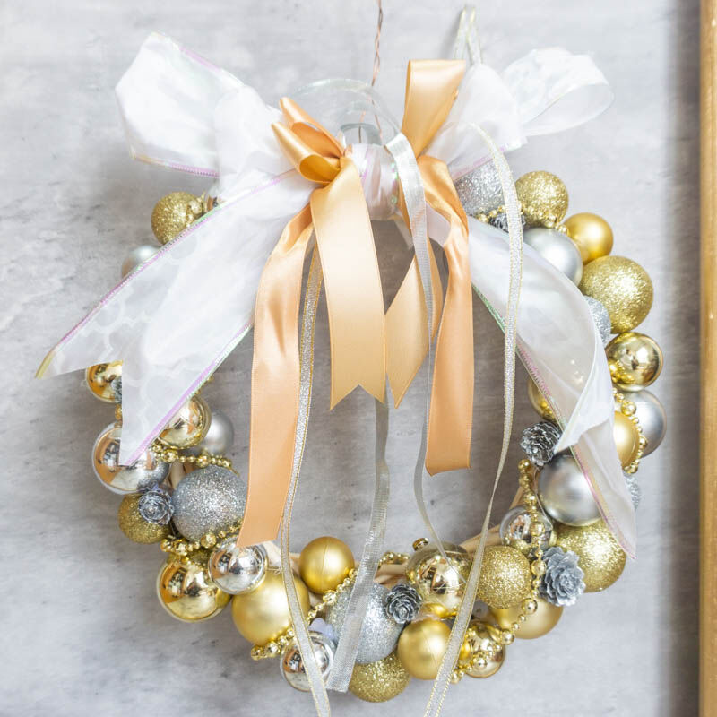 クリスマスオーナメントや松ぼっくりをひたすらグルーガンでひっつけたら完成〜!30分もあれば完成します。