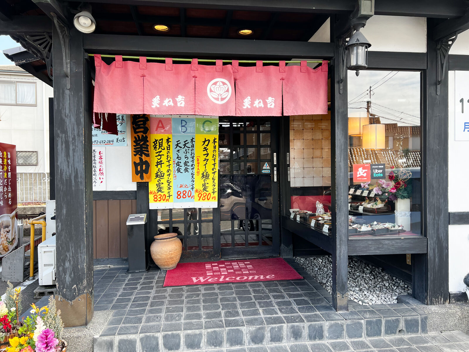 「美ね吉」と大きく書いた看板と赤い暖簾が目印です。