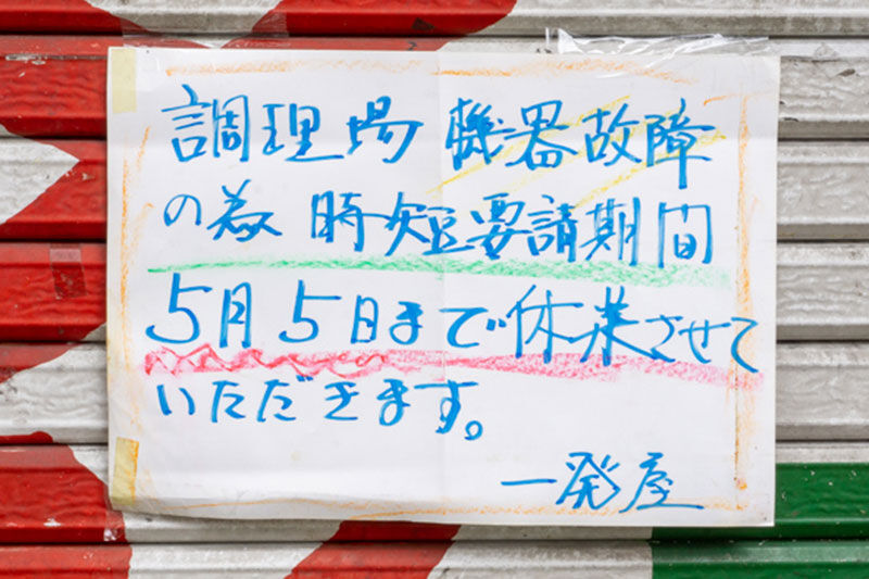 貼紙には調理場機器故障のため、時短要請期間の5月5日まで休業とのこと。