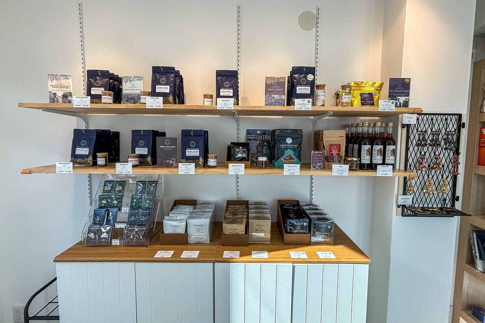 棚にはイエメンコーヒーの豆やコーヒーに関する商品がおいてありました。