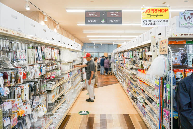 100円ショップ「ワッツウィズ」は両サイドの棚で、裏面もワッツウィズ。レジはスーパーと同じなところも嬉しいですね〜。