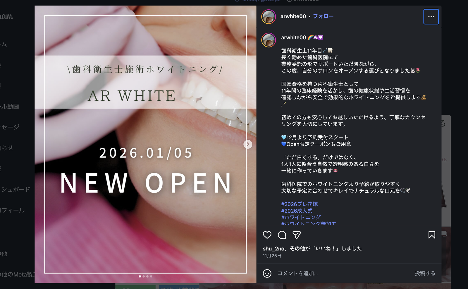 投稿によると、歯科衛生士によるホワイトニングサロン「AR WHITE」が2026年1月6日にオープン予定とのこと。