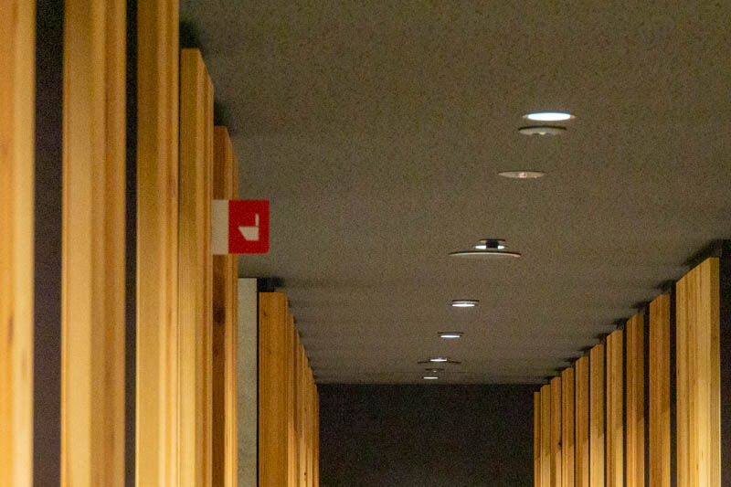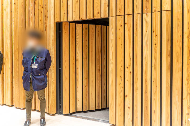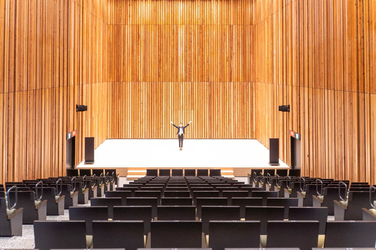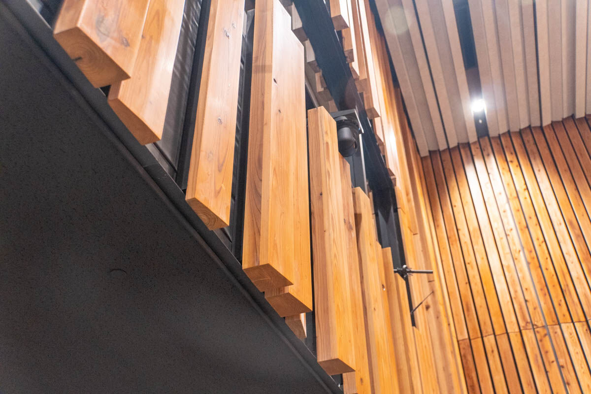 壁から天井まで木製ルーバーで覆われていまして、舞台もその仕様になっているんですが↓