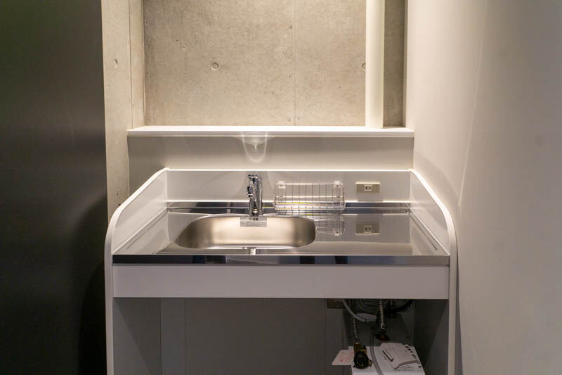 洗面台もガラス張りにコンクリートのつくりがオシャレ。