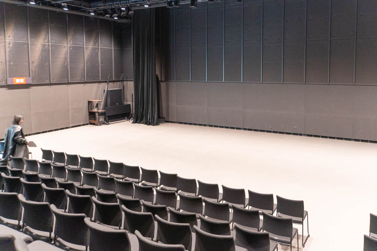 大スタジオは168席のひな壇仕様で、演劇・ダンス公演に特化したホール。