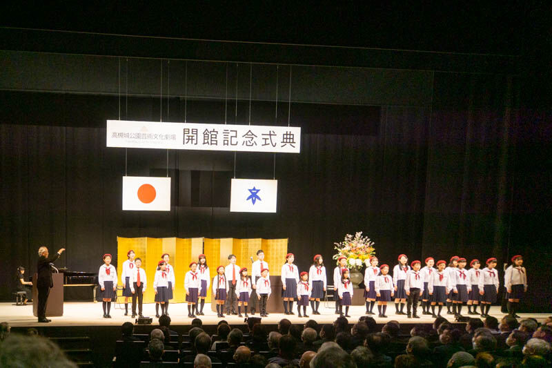 続いて映像や緞帳のお披露目のあとに、高槻市少年少女合唱団による市歌斉唱。
