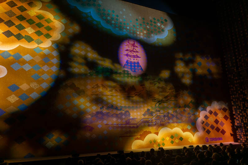 盛大な音楽とともに内覧会では見られなかった緞帳が披露されました。こちらは西陣織の綴織という種類とのこと。