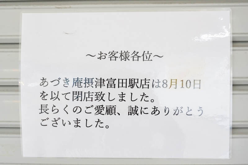 「あづき庵 摂津富田店」は8月10日をもって閉店したとのこと。