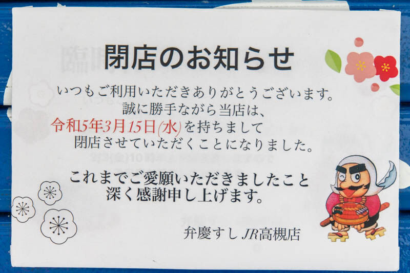 紺屋町の「弁慶すし JR高槻店」が閉店しています。