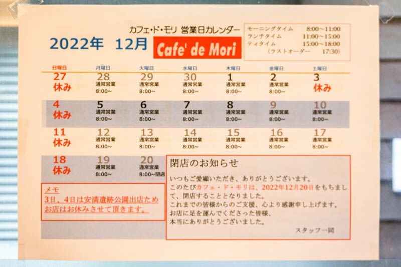 たかつき本通りの「Café de MORI(カフェ・ド・モリ)」が12月20日で閉店するようです。