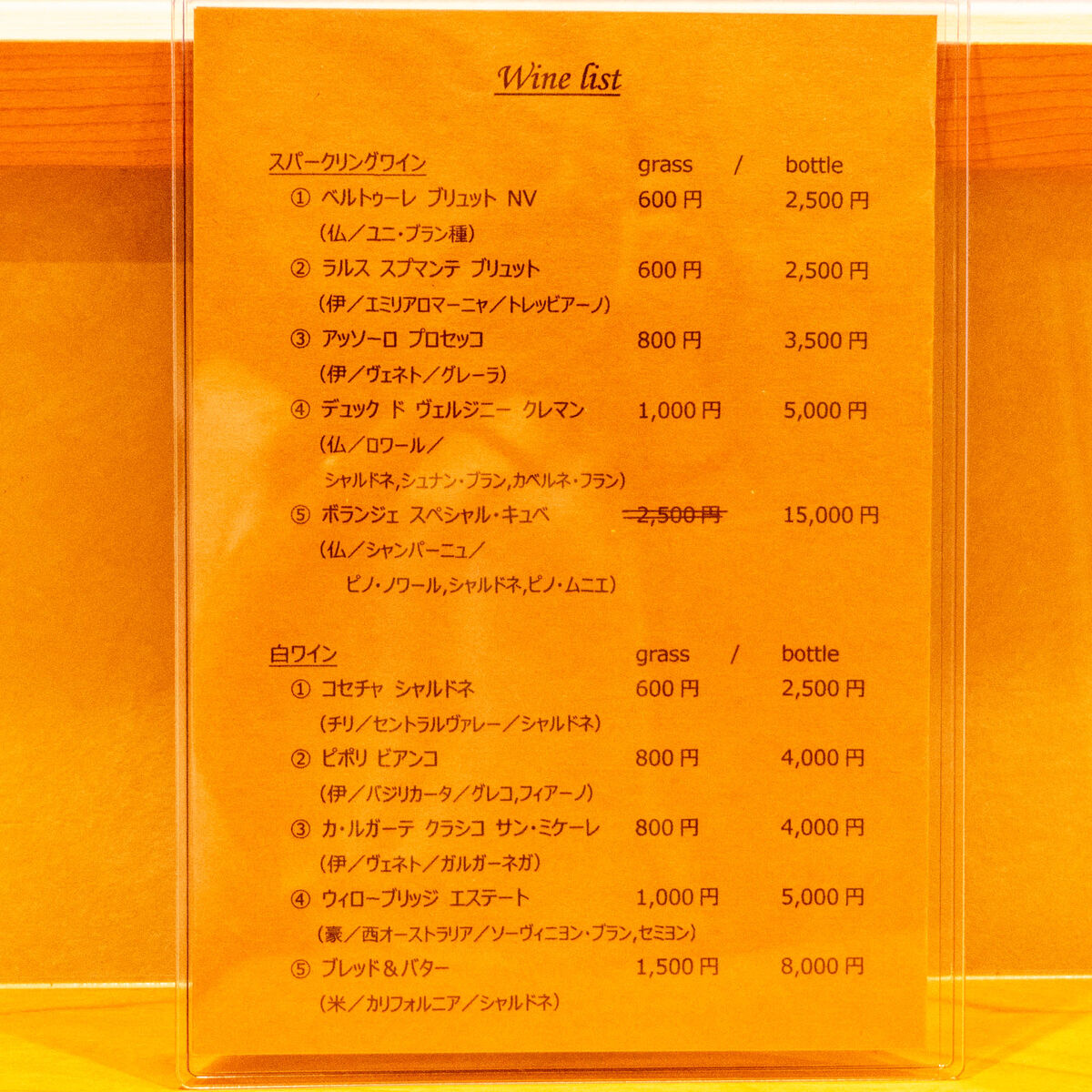 本日のハウスワインなどは壁の黒板メニュー表に↓