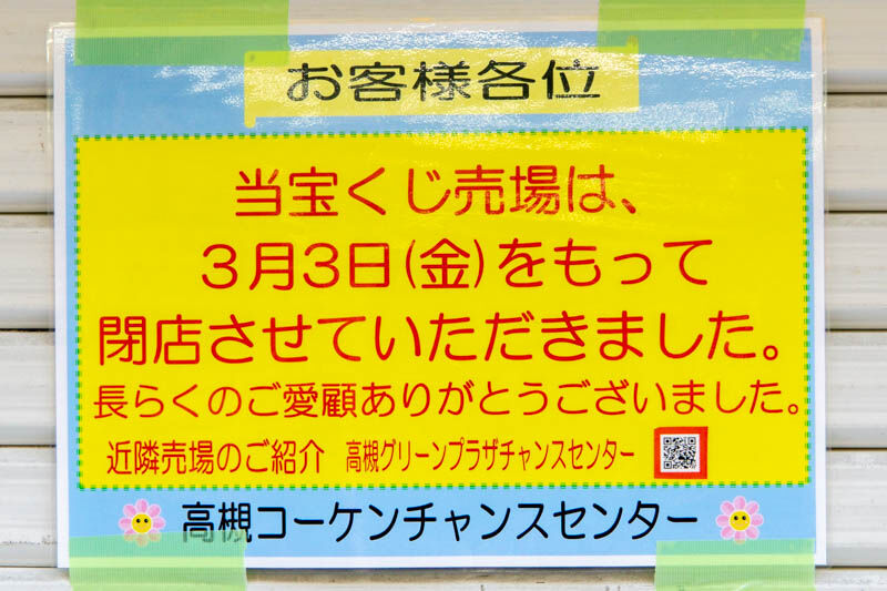 お知らせによると、宝くじ売場の「高槻コーケンチャンスセンター」は3月3日をもって閉店したとのこと。