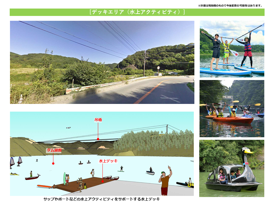 ダム湖の湖面を活かし、サップやカヌーなどの水上アクティビティが楽しめるエリア。