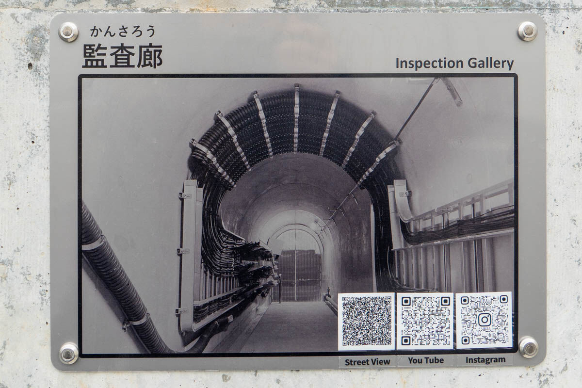 「監査廊」といって、こちらは完成後の監査、各種の測定、堤体および基礎の排水、グラウト作業、ゲート操作などを行うために設けられた通路なんだそう。