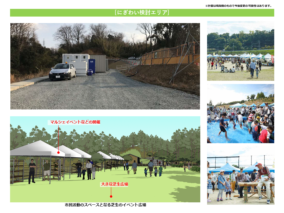 いち早くオープンする「拠点施設エリア」は駐車場や府道に面した『公園の玄関口』とのこと。多目的室を備えた施設棟のほか、広さのある通路ではマルシェなどの催しも可能なんだとか。