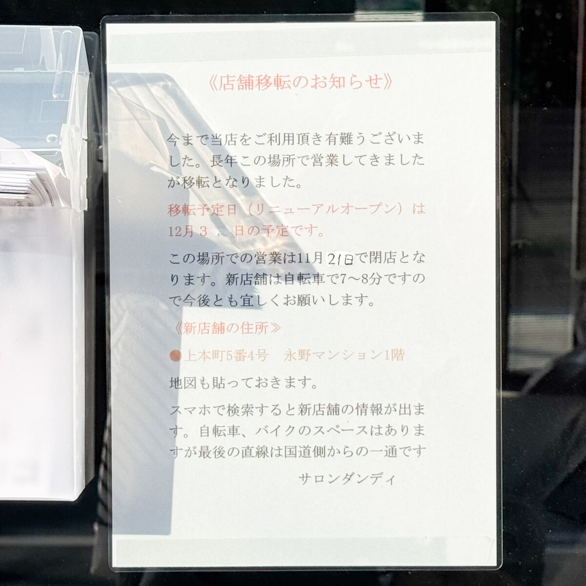 旧店舗にあった貼紙によると、ヘアカット専門店「SALON DANDY(サロン ダンディー)」は長年、土橋町で営業されていましたが11月21日で閉店し、12月3日に上本町に移転リニューアルオープンしたとのことです。