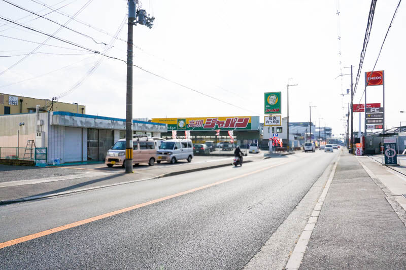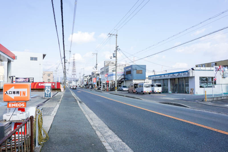 目の前にはエネオスがあり、こっちに行くと2輪ショップ「鈴創」や、建設中の倉庫「グッドマン」、ユニクロなど過ぎそのまま進んでいくと市役所方面です。