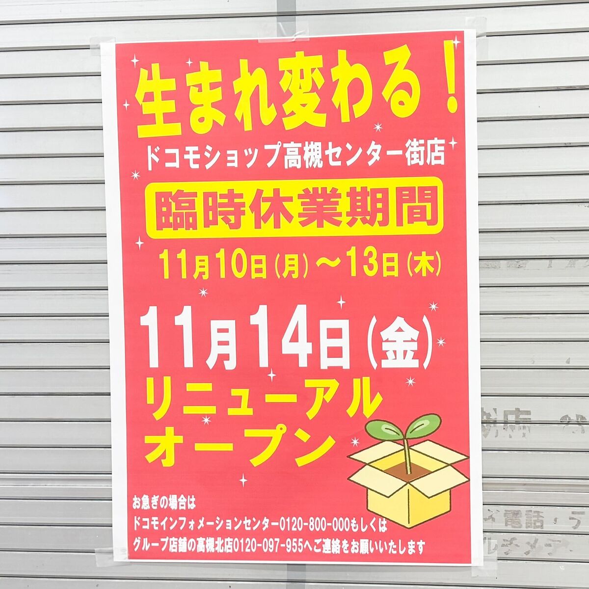 高槻センター街の「ドコモショップ 高槻センター街店」がリニューアルのため休臨時業しています。
