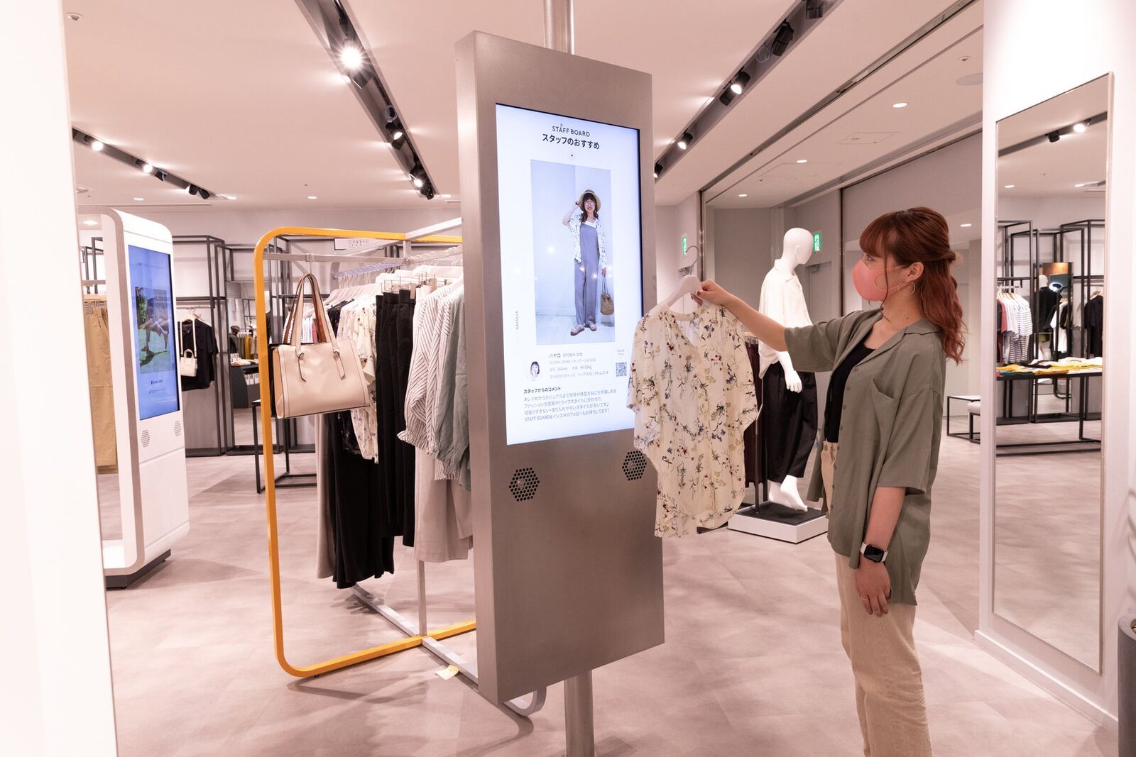 たとえば上記写真のパネルには、スタッフが日々のコーディネートを投稿している「STAFF BOARD」を表示し、連結するラックに同じ商品があるため、コーディネートの参考できたりするそう。