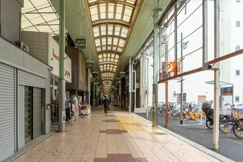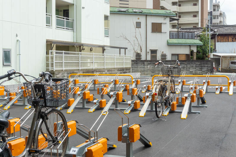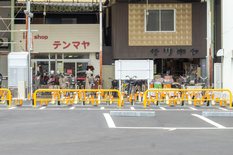芥川商店街につくってた時間貸しの駐輪場がオープンしてる。バイクと車はまだ
