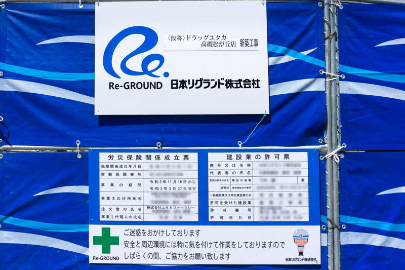 「(仮称)ドラッグユタカ高槻松が丘店」とありますのでドラッグユタカが建設中なのがわかります。