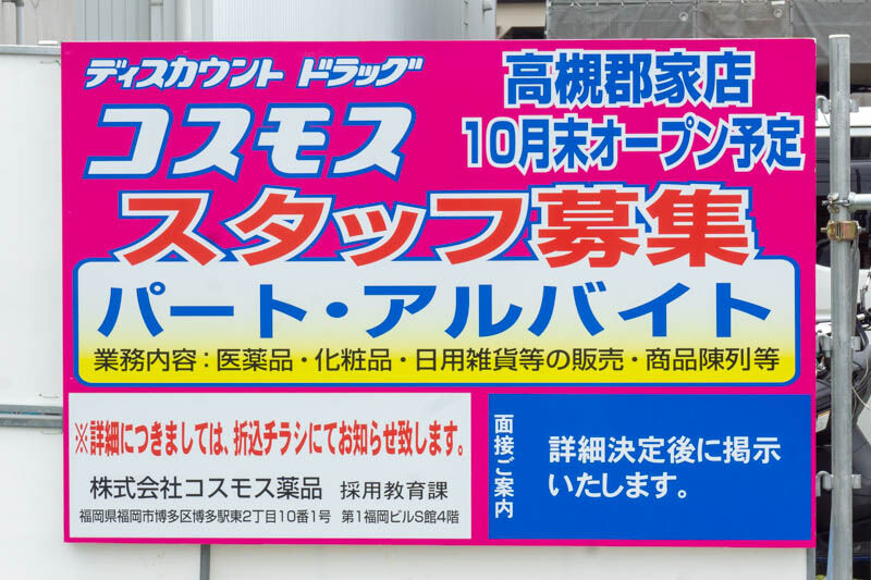 郡家新町につくってるドラッグストア「ドラッグコスモス」のオープンは10月末