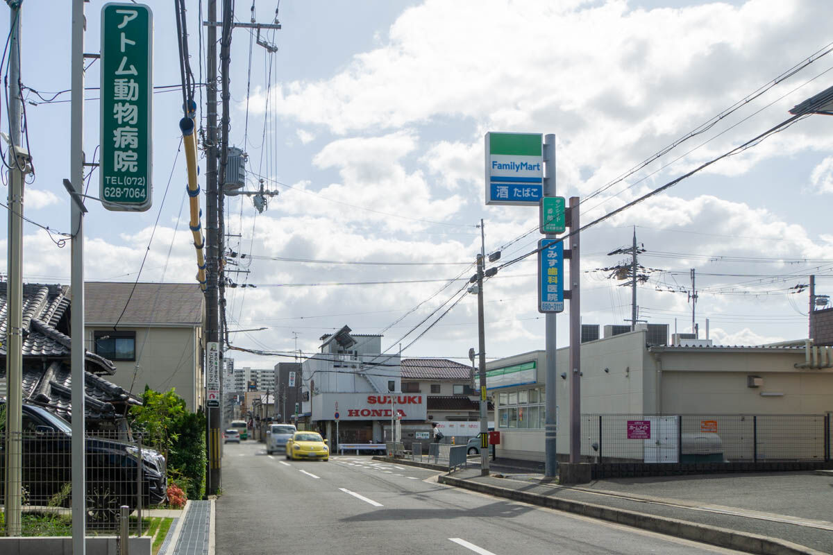 反対方向に行くと、ジョーシンや高槻第四中学校などがありJR摂津富田駅方面。