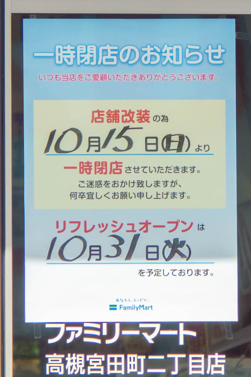 府道115号線ぞい宮田町のファミリーマートが改装のため一時休業。10月31日リニューアルオープン