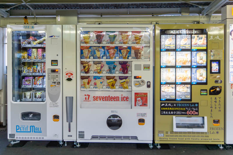 阪急総持寺駅のホームに餃子やラーメンの自販機ができてる。冷凍食品「FROZEN Lab.」の自販機