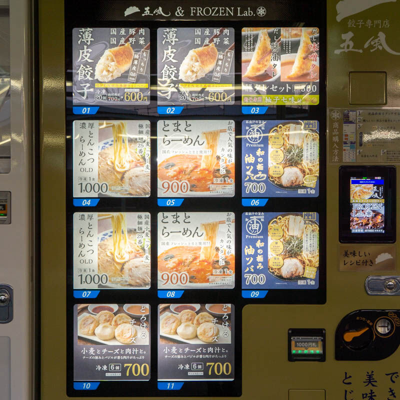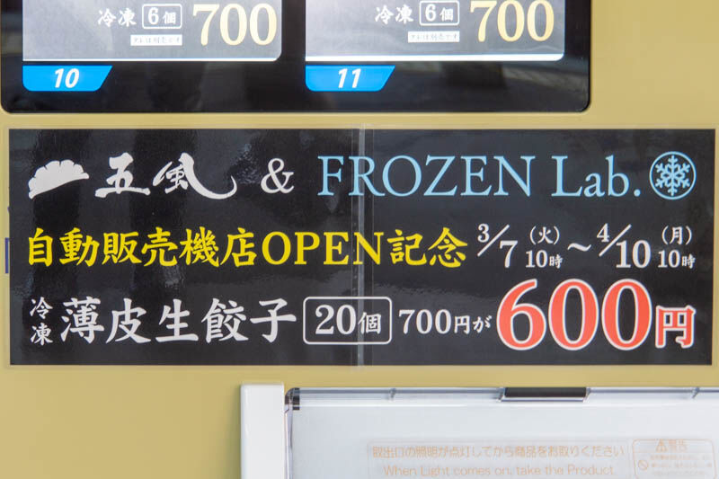 自販機の上の方に「五風&FROZEN Lab.」とありますが、2022年11月に阪急総持寺駅近くにオープンした生餃子専門店「小麦とだし 五風」と併設の特殊冷凍料理店『FROZEN Lab.』の商品のようです。