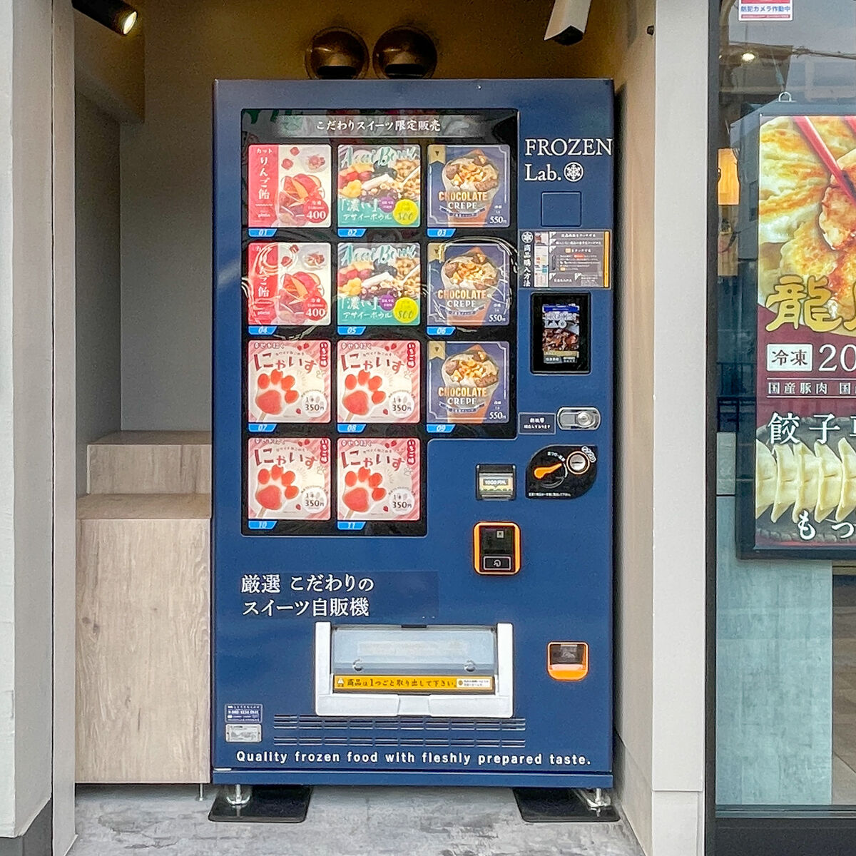 お店の外にある自動販売機にはりんご飴やチョコレートクレープなどの美味しそうなスイーツが販売されていました。
