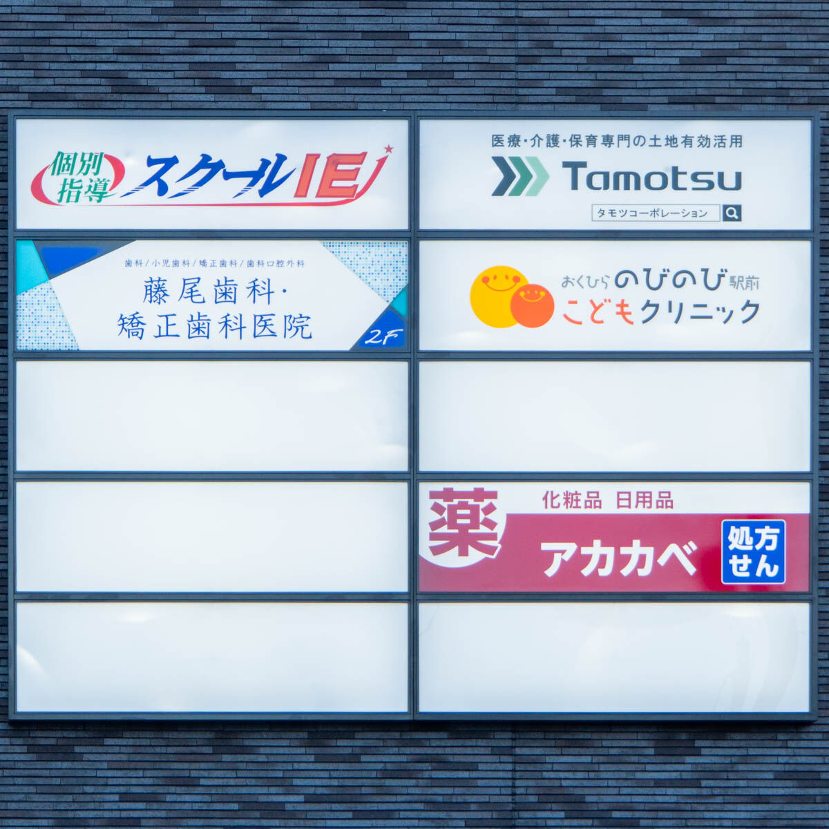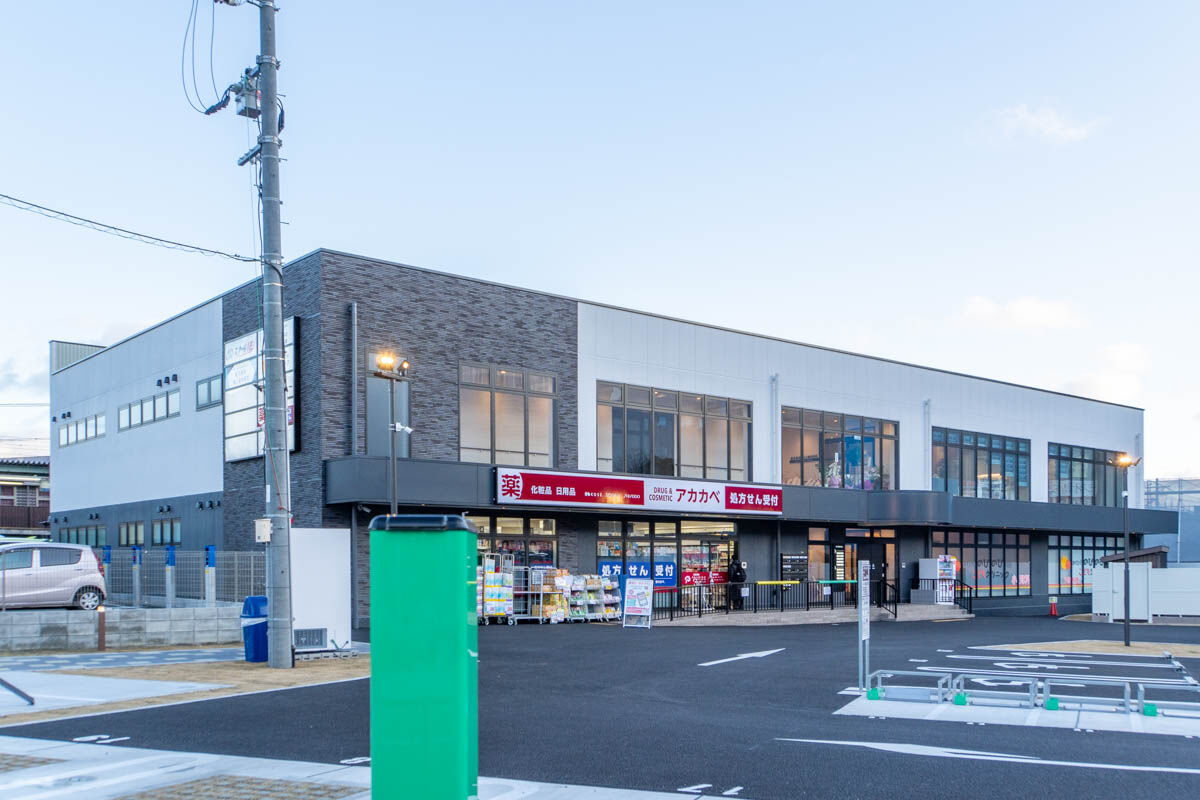 JR島本駅駅前ビルには1階に「アカカベドラッグ/薬局」「おくひらのびのび駅前こどもクリニック」、2階に「スクールIE」がオープンしており、開店時に記事に。