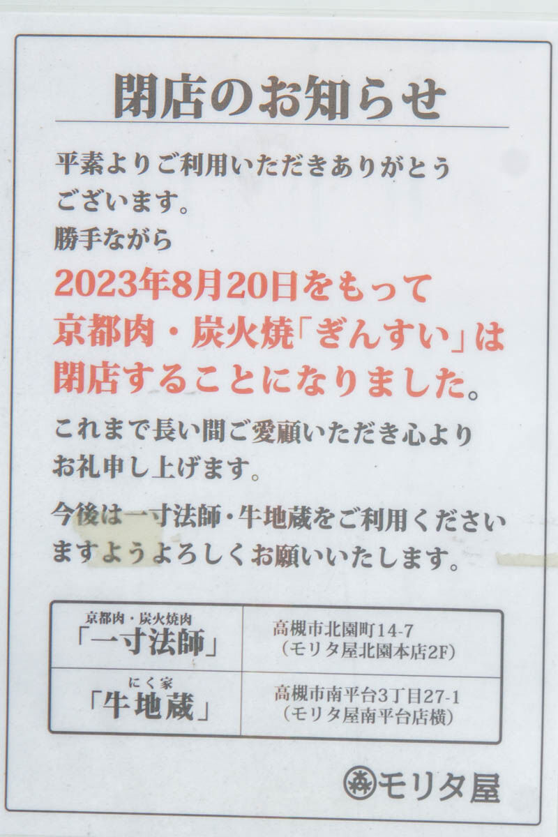 「ぎんすい」は高槻市内を中心に展開しているスーパー『ミートモリタ屋』によって運営されていた焼肉店。