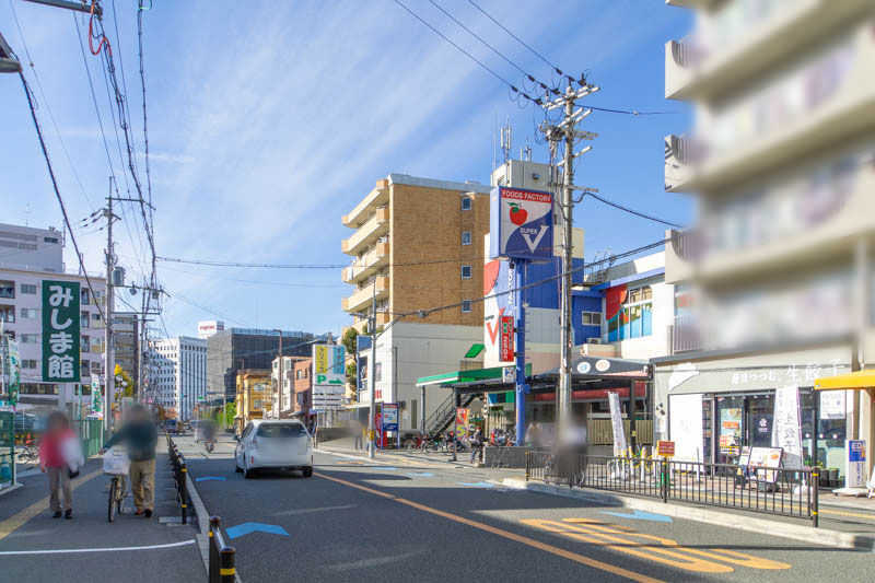 反対方向に行くと、FRESCOや大阪行岡医療大学などがあり、JR総持寺駅方面。