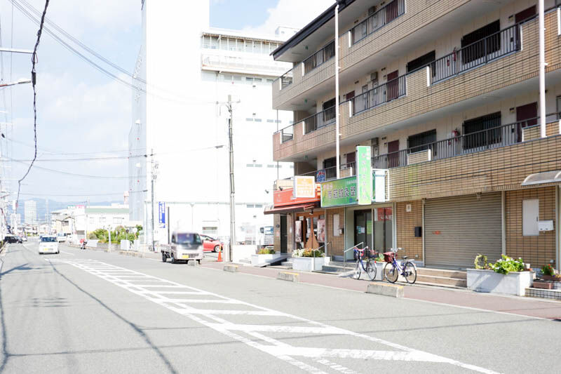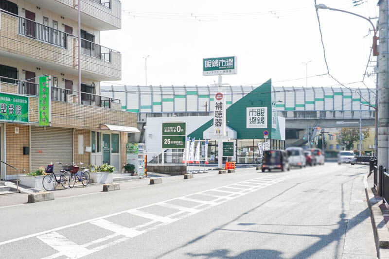 反対方向に行くと、眼鏡市場や府道14号線の高架、くぐると8月にオープンした「大分からあげ わん」、下田部団地の方です。