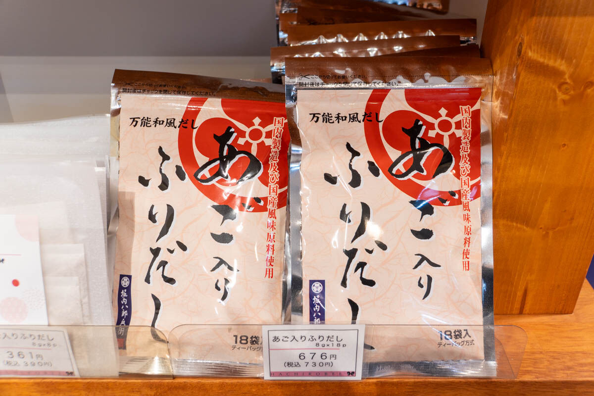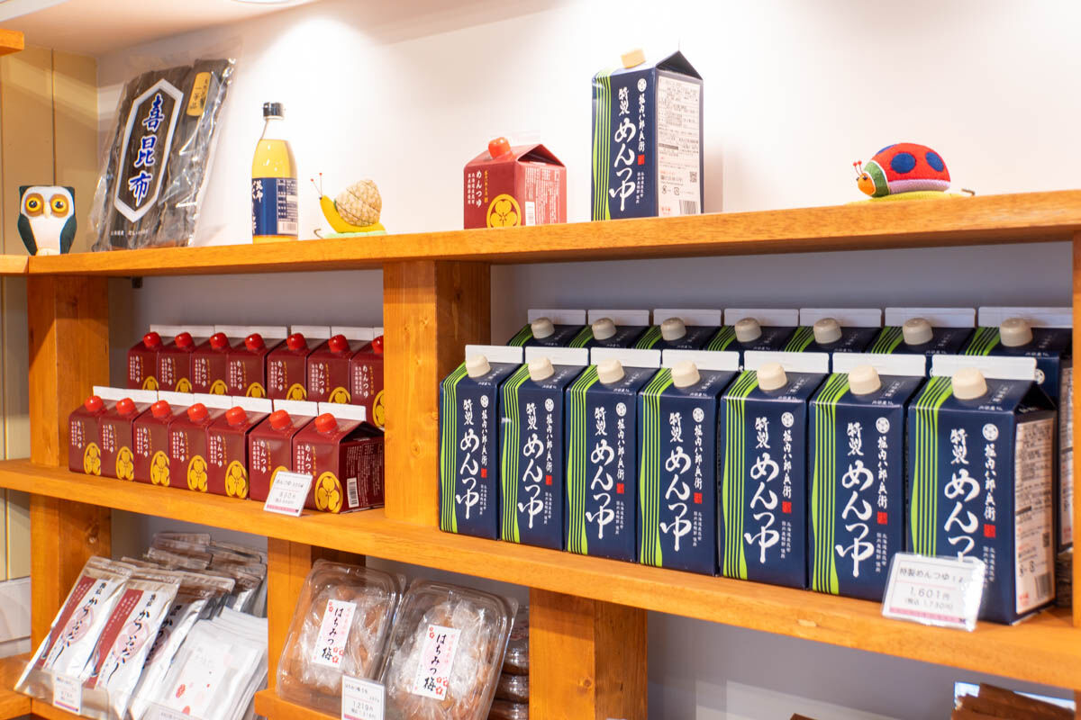 店内では、だしに関する商品やめんつゆが並んでいます。