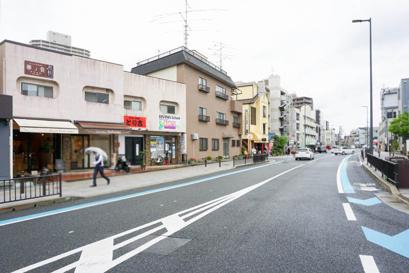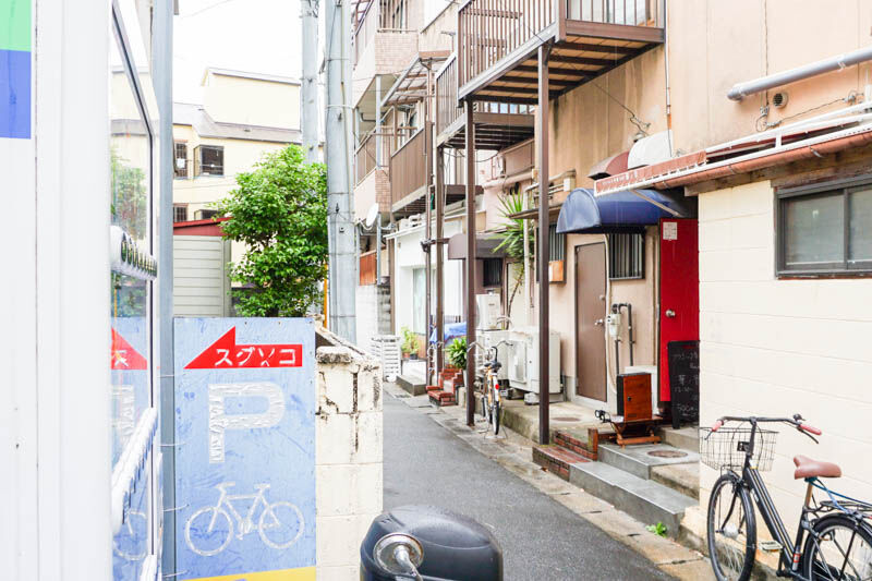 入口がある場所は、自転車やバイクが通れるくらいの細い裏路地でして、斜め前(写真左側)には駐輪場があります。