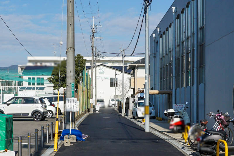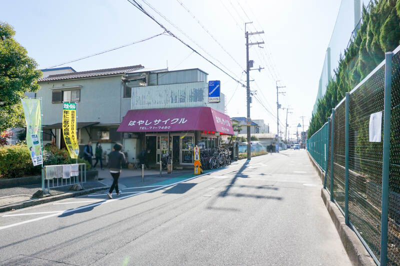 はやしサイクルがある角を曲がると、リハビリプラザ高槻の裏側ですが、ポールが立っています。
