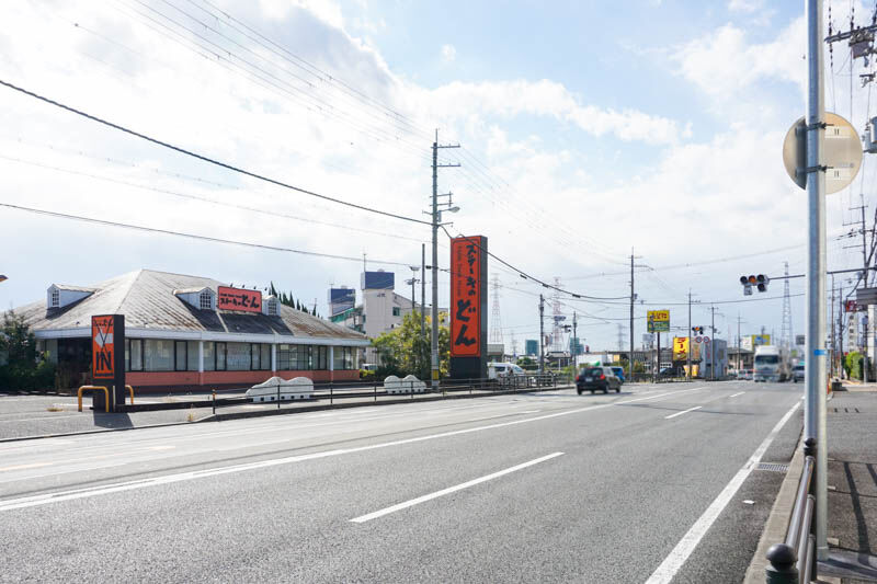 反対方向に行くと、びっくりドンキーやGU、家具店「マナベインテリアハーツ」、移転予定の大北製作所などがあり、京都方面。