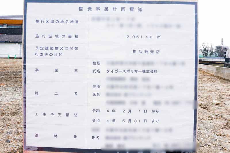 看板を見ると、「タイガースポリマー株式会社」が事業主とのこと。隣の敷地にはグループ企業である高槻化成株式会社という会社があるので、その関連する施設の可能性もありそう。