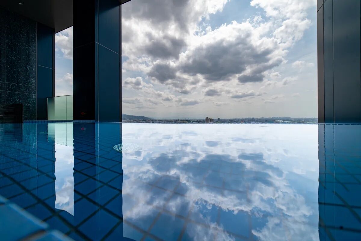 目玉でもある「天空のスカイスパ」は、水の切れ目がそのまま地平へつながる、インフィニティプールならぬインフィニティ露天風呂が特徴。