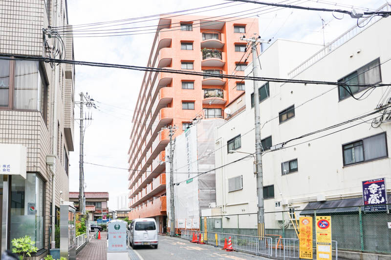 写真では写っていませんが、服部不動産とローソンストア100の間を入ったところの明るい茶色の建物。