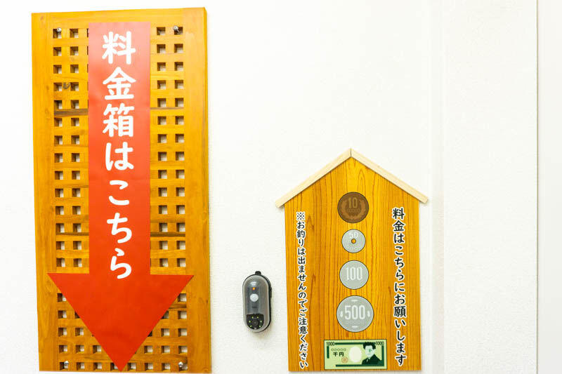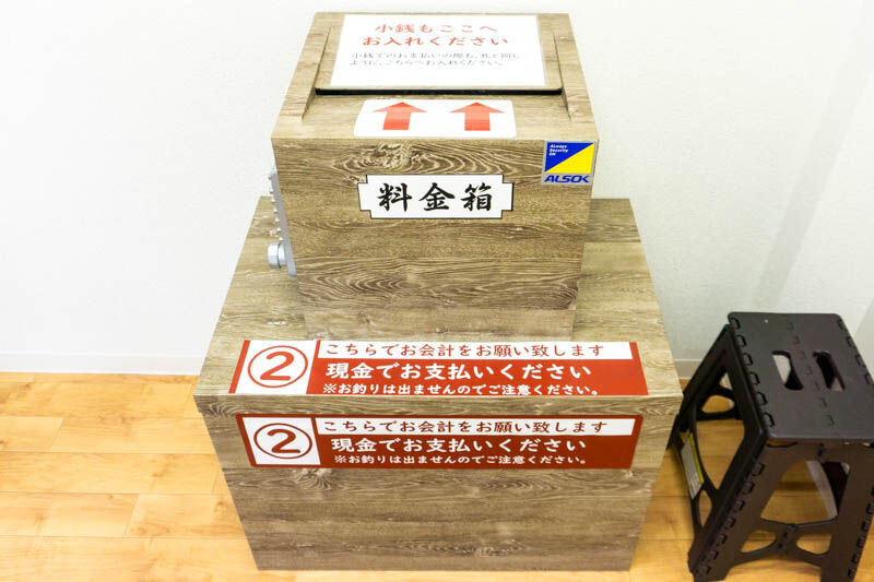 賽銭箱風の料金箱!現金で支払うシステムで、お釣りは出ませんのでご注意ください。