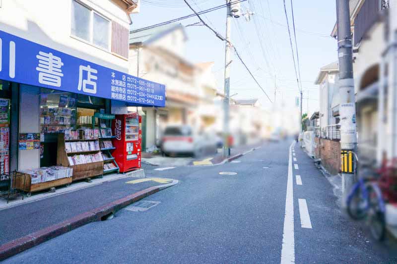 書店を目印にこっちに行く、と高槻中学校・高校やバー「おつまみ酒場 七丸」、進んでいくと「餃子 藤」やパティスリー&カフェサロン「マガザン ド エクラ」などがある明野町方面。