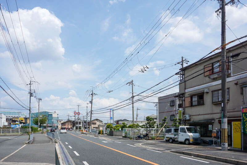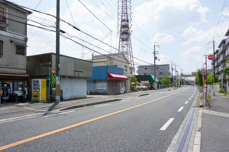こっちに行くと、写真には写っていませんが向かい側に芝生住宅東口の停留所が、右側にはセブンイレブンがあって府道16号線に。