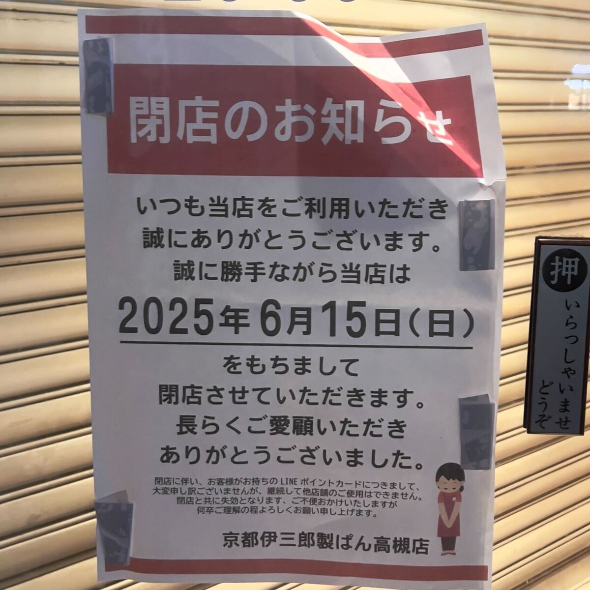 松坂屋の「京都伊三郎製ぱん 高槻松坂屋店」が6月15日で閉店するようです。