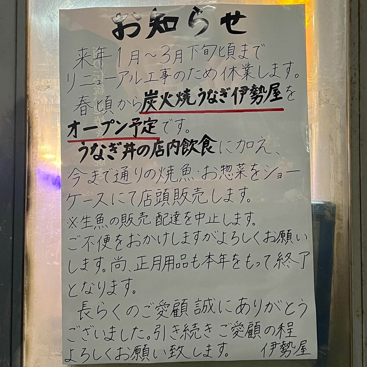 そして春頃に「炭火焼うなぎ伊勢屋」としてリニューアルする予定なんだとか。今まで通り、焼魚やお惣菜の店頭販売は変わらず、店内ではうなぎ丼がいただけるようになるそうです。