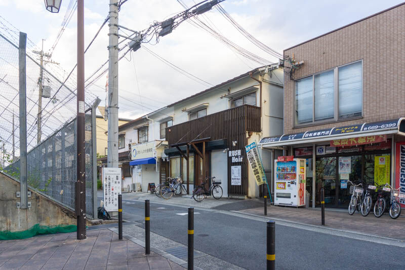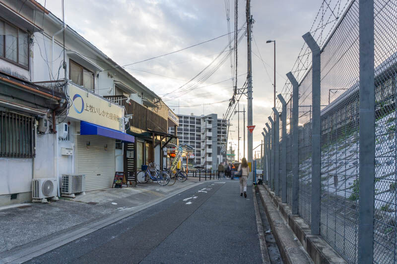 こっちに行って右に曲がり高架をくぐると上牧駅前。左に行くと国道171号線へ。